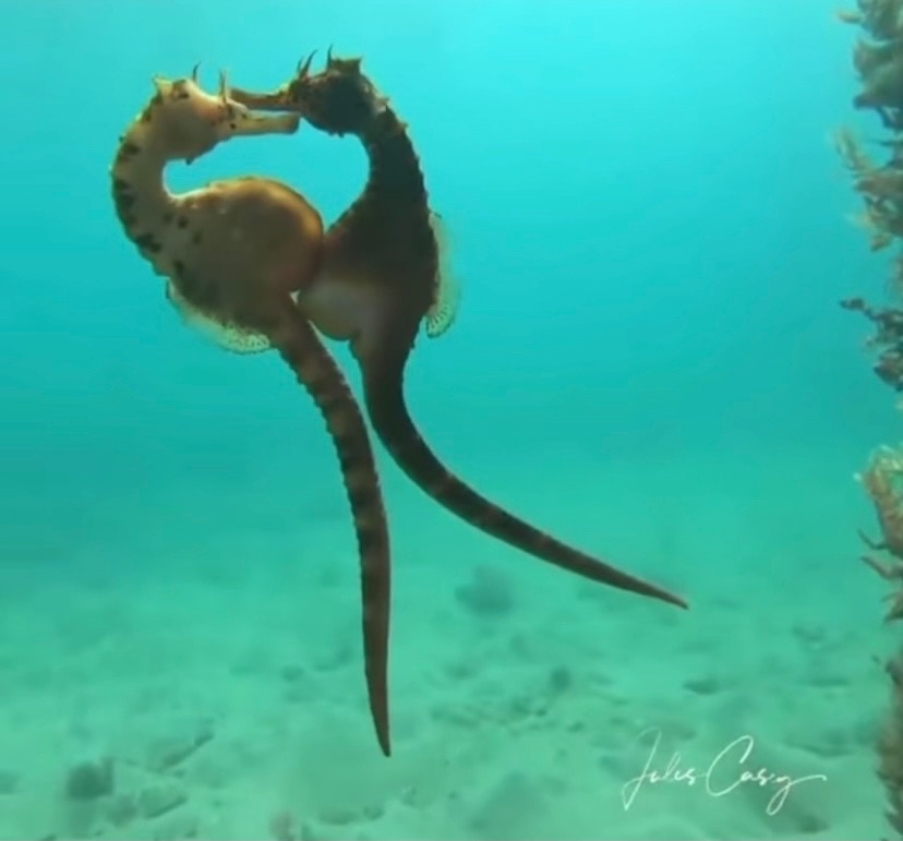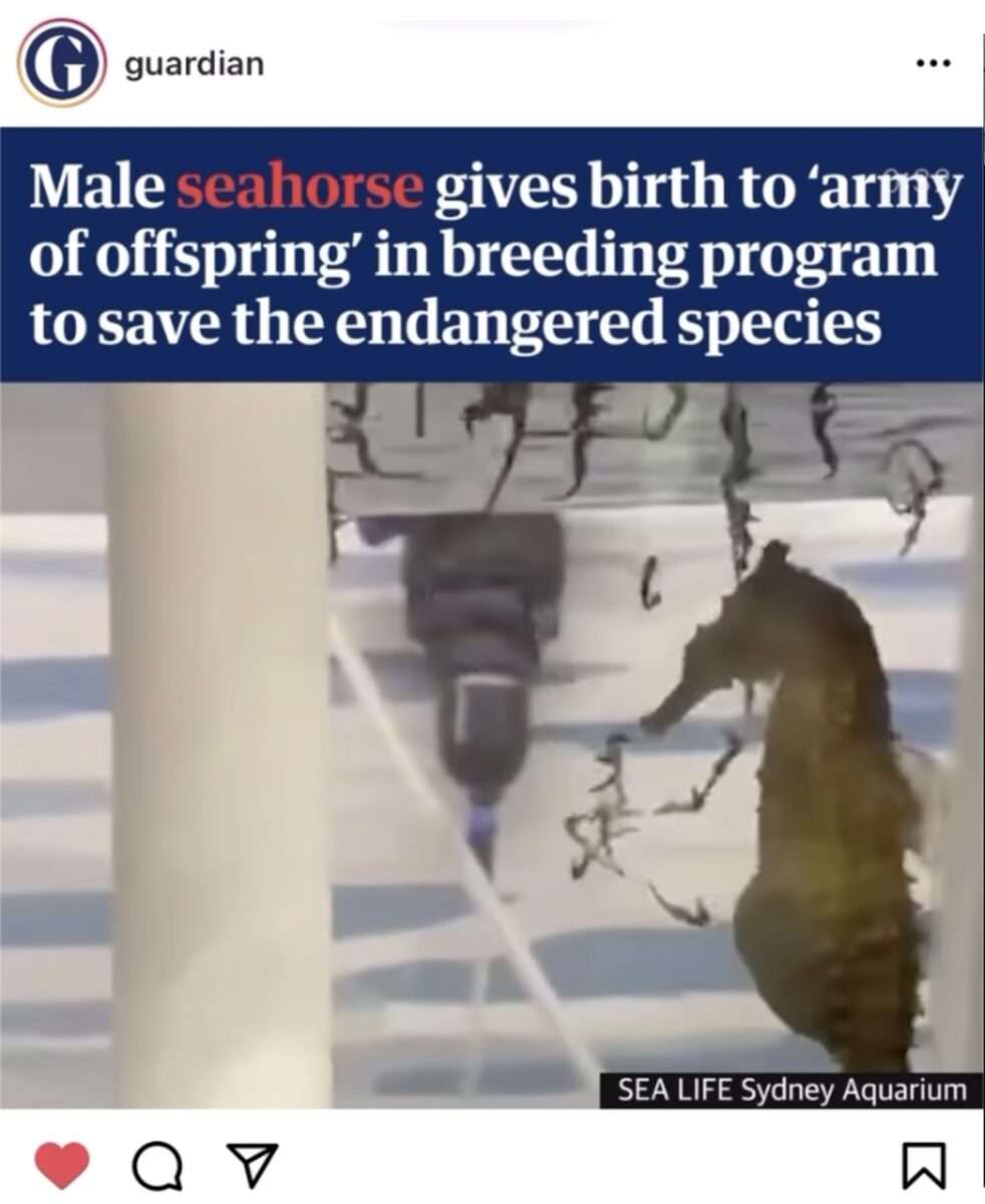 “🧬 peep the video of a female seahorse impregnating a male seahorse. Before they get down to action, the seahorse pair conducts a courtship dance to synchronize their movements. The female then inserts her ovipositor into the male’s brood pouch to deposit her unfertilized eggs. The male then releases his sperm into the seawater. Even more interesting is that his sperm find their way into his pouch to finish the process. Scientists are not sure how the sperm find their way to the pouch. After two weeks of pregnancy, the male gives birth and leaves his offspring to procreate with a new seahorse bae. The cycle continues until mating season is over 🎥 video credit: @onebreathdiver “